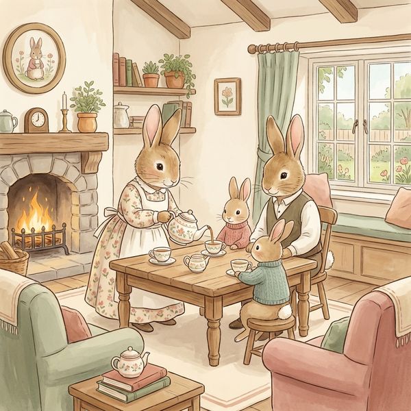 Captures the classic charm of timeless children's picture books, reminiscent of Beatrix Potter, with a modern digital twist that maintains a traditional, heartwarming feel.
