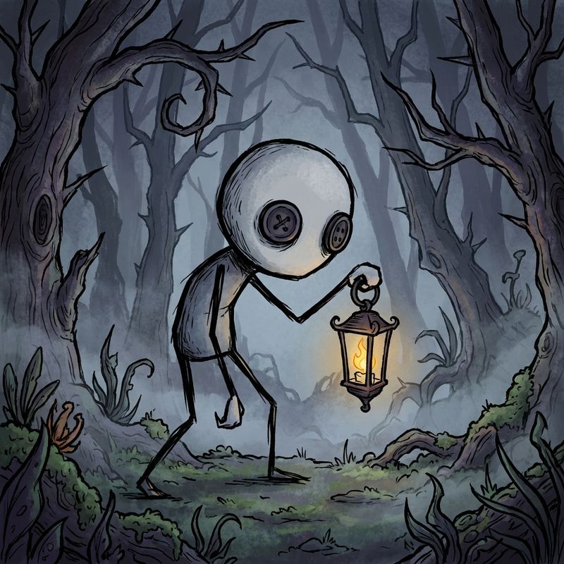 Reminiscent of Don't Starve's character design, with a blend of creepy cute aesthetics similar to Junji Ito's horror elements, and Adventure Time's whimsical darkness. Digital illustration with thick, defined outlines, a slightly rough texture to imitate hand-drawn feel. Lighting is soft but contrasty, creating a dark but readable mood.