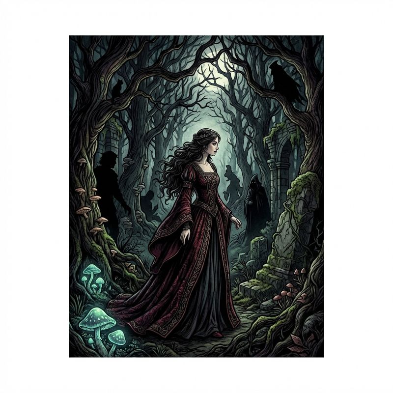 Dark, romantic illustration style inspired by classic fairy tale illustrations and gothic art. Rich, detailed linework with dramatic lighting. Influenced by Arthur Rackham, Edmund Dulac, and Brian Froud. Intricate but not overwhelming detail.